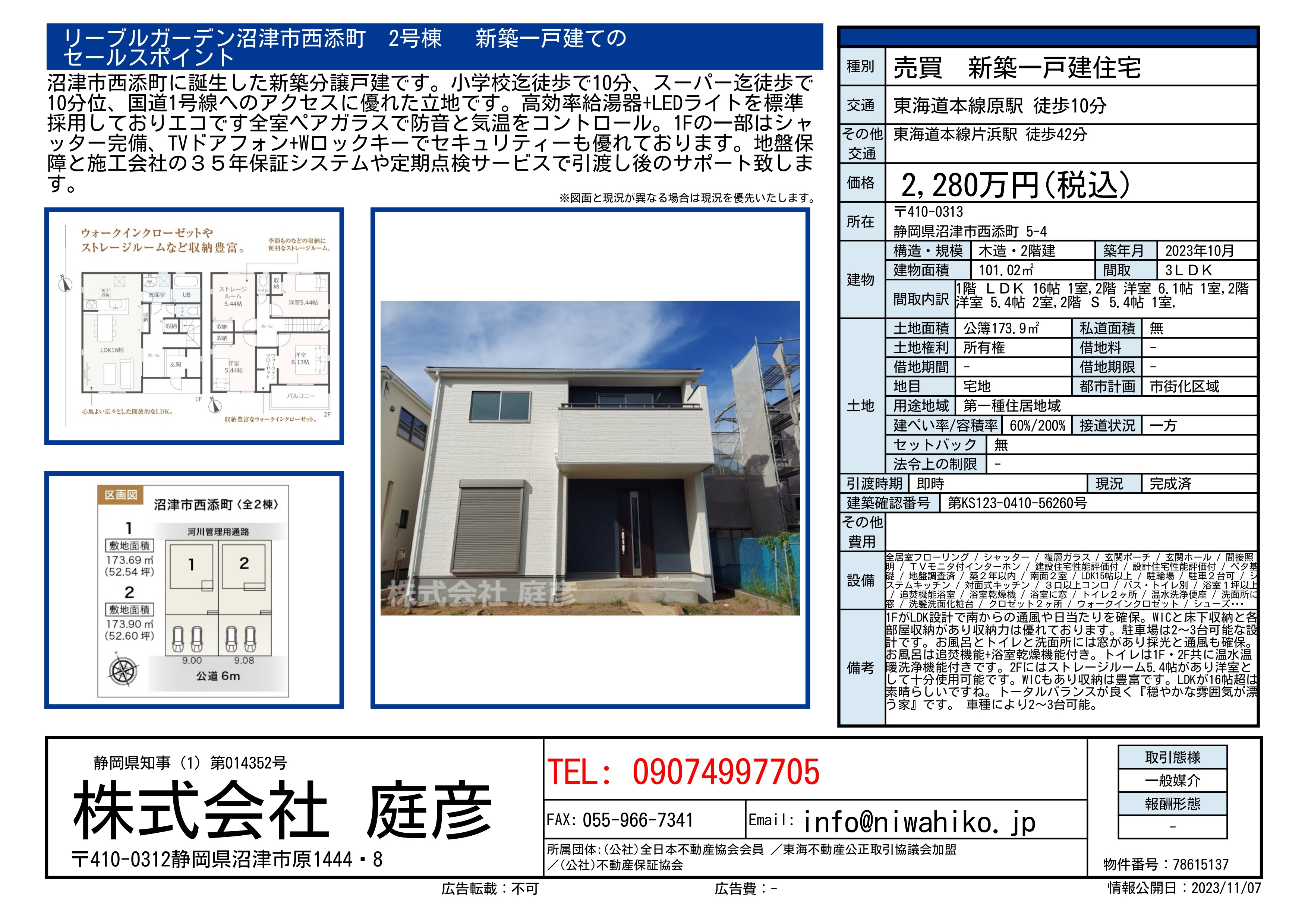 沼津市西添町に誕生した新築分譲戸建です。小学校迄徒歩で10分、スーパー迄徒歩で10分位、国道1号線へのアクセスに優れた立地です。高効率給湯器+LEDライトを標準採用しておりエコです全室ペアガラスで防音と気温をコントロール。1Fの一部はシャッター完備、TVドアフォン+Wロックキーでセキュリティーも優れております。地盤保障と施工会社の35年保証システムや定期点検サービスで引渡し後のサポート致します。